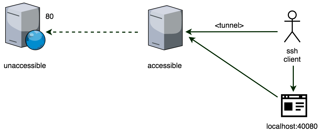 We need reach the port 80 of the unaccessible as if it were local port 40080. In this case we can easily configure a LocalForward as follows: