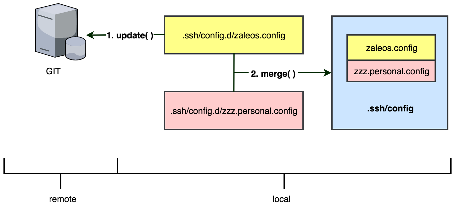 zaleos.configfrom the repo and stores it in the~/.ssh/config.d/folder. - Generates a new