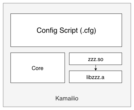 The implementation of the zzz module can be found here. This module exports two params called number and text, it instantiates a Core object when Kamailio starts and destroys it when Kamailio finishes its execution. This module also exports a function called get_incremented_number_mod which returns the number of our Core object (incremented by one). Another interesting thing to mention is the Makefile, which dynamically compiles our libzzz library and links it to the module.