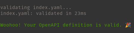 openapi lint --config <path-to-lint-file> <path-to-openapi-index-file>If Open API doesn't catch any warning or error, you should see a valid message!